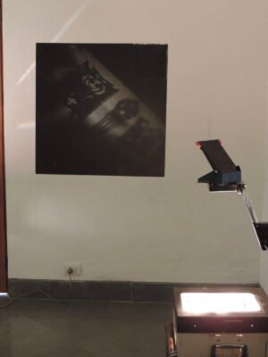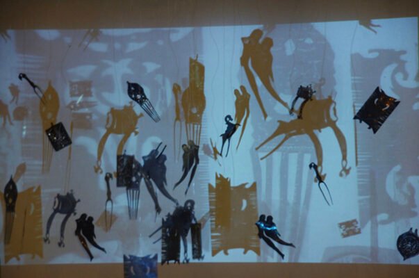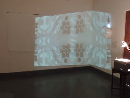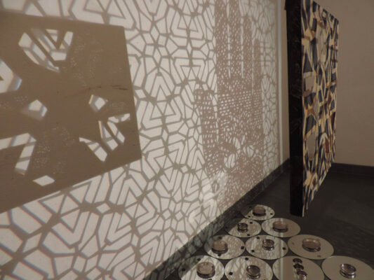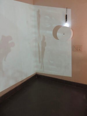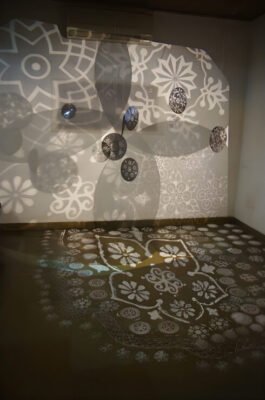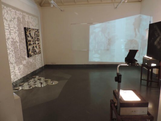5m x 4m – Projections, Diorama Boxes, Ochres on Canvas, Tin Kolum Stencils, Mirrors, Film, Soundscape