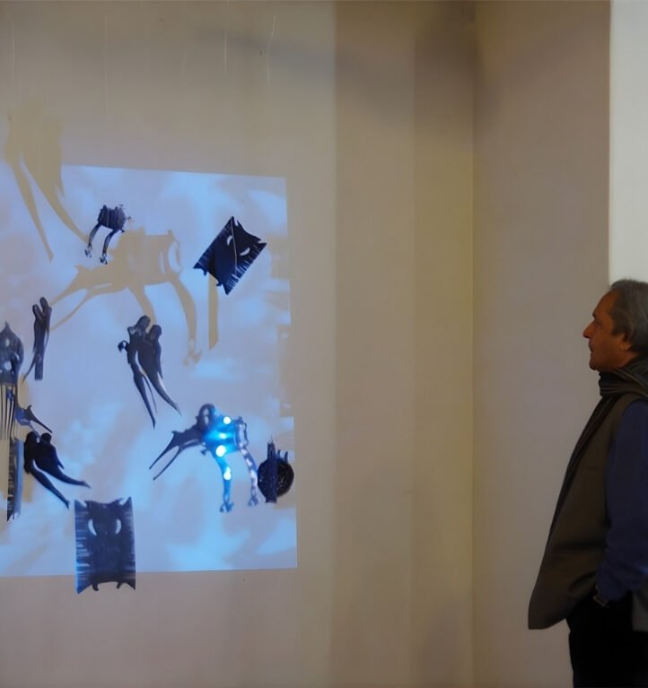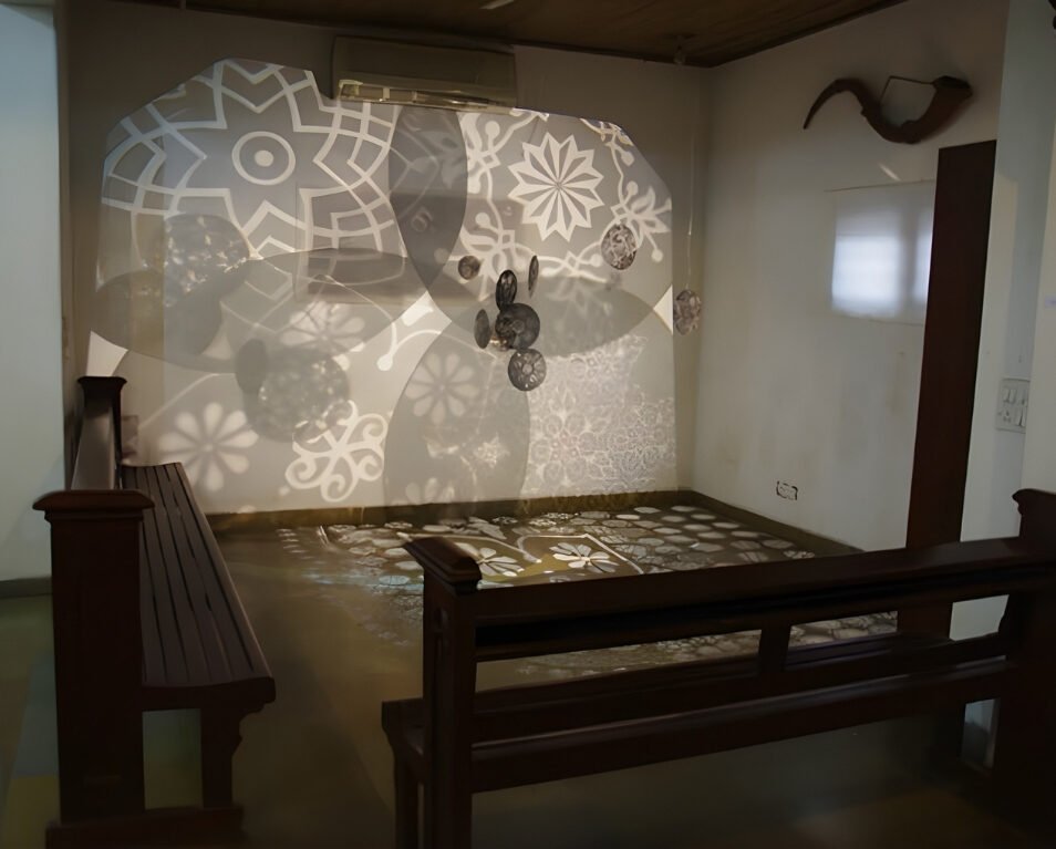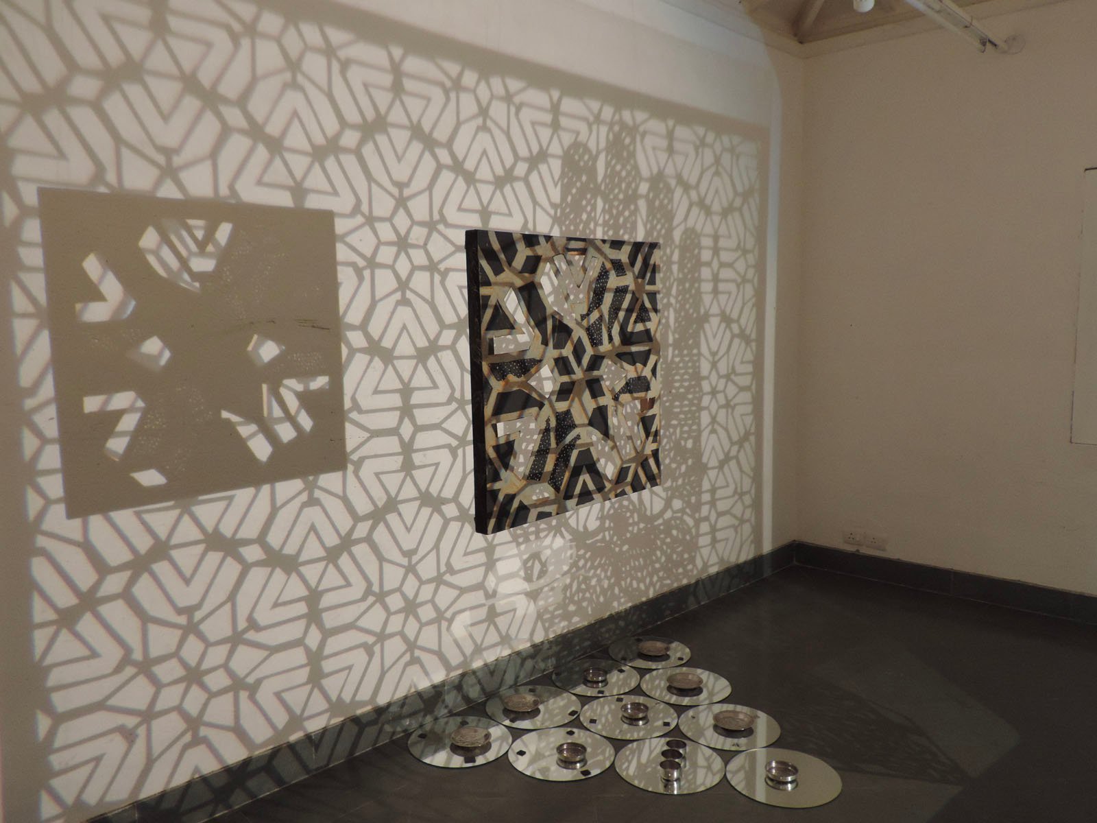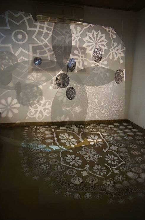 5m x 4m – Projections, Diorama Boxes, Ochres on Canvas, Tin Kolum Stencils, Mirrors, Film, Soundscape