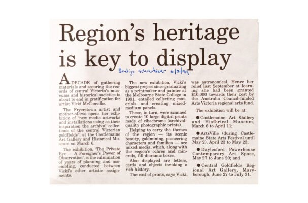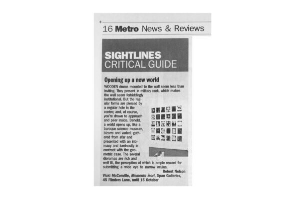 ‘…Behold, a world opens up. Like a baroque science museum, bizarre and varied, gathered from afar and presented with an intimacy and luminosity – the perception of which is ample reward for submitting a wide eye to narrow oculus ..’ Robert Nelson, The Age, 2005