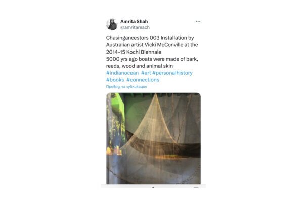 ‘…Chasingancestors 003 Installation by Australian artist Vicki McConville at the 2014-15 Kochi Biennale. 5000 yrs ago boats were made of bark, reeds, wood and animal skin #indianocean #art #personalhistory #books #connections…’ Amrita Shah, @amritareach, 2022
