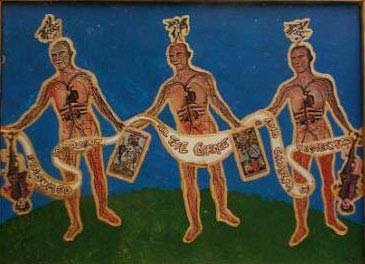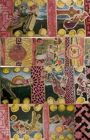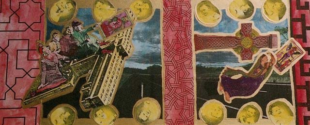 The small A4 collages began by assembling cartoons, postcards, maps, sweet wrappers, tin prayer plates, news paper stories of the day and personal memorabilia.