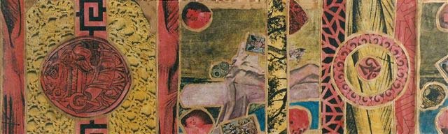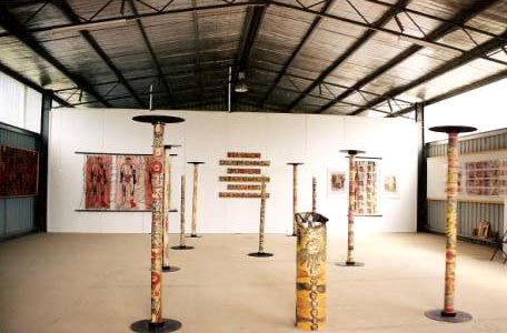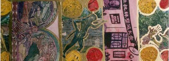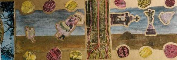The Open For Inspection mixed media panels and ‘totem’ poles began as a series of small collages created when Vicki McConville lived in Europe in the mid to late 1980’s.