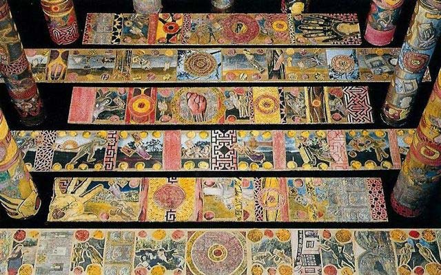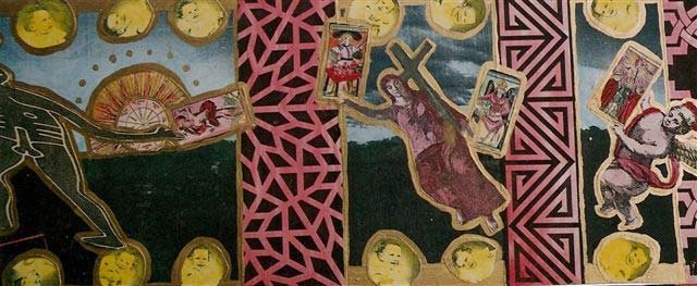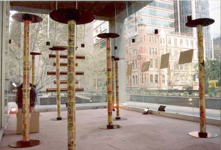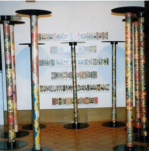 Mixed Media: panels and poles, paper, acrylic, oil, enamel. 20cmx30cm and 15cm x 200cm
